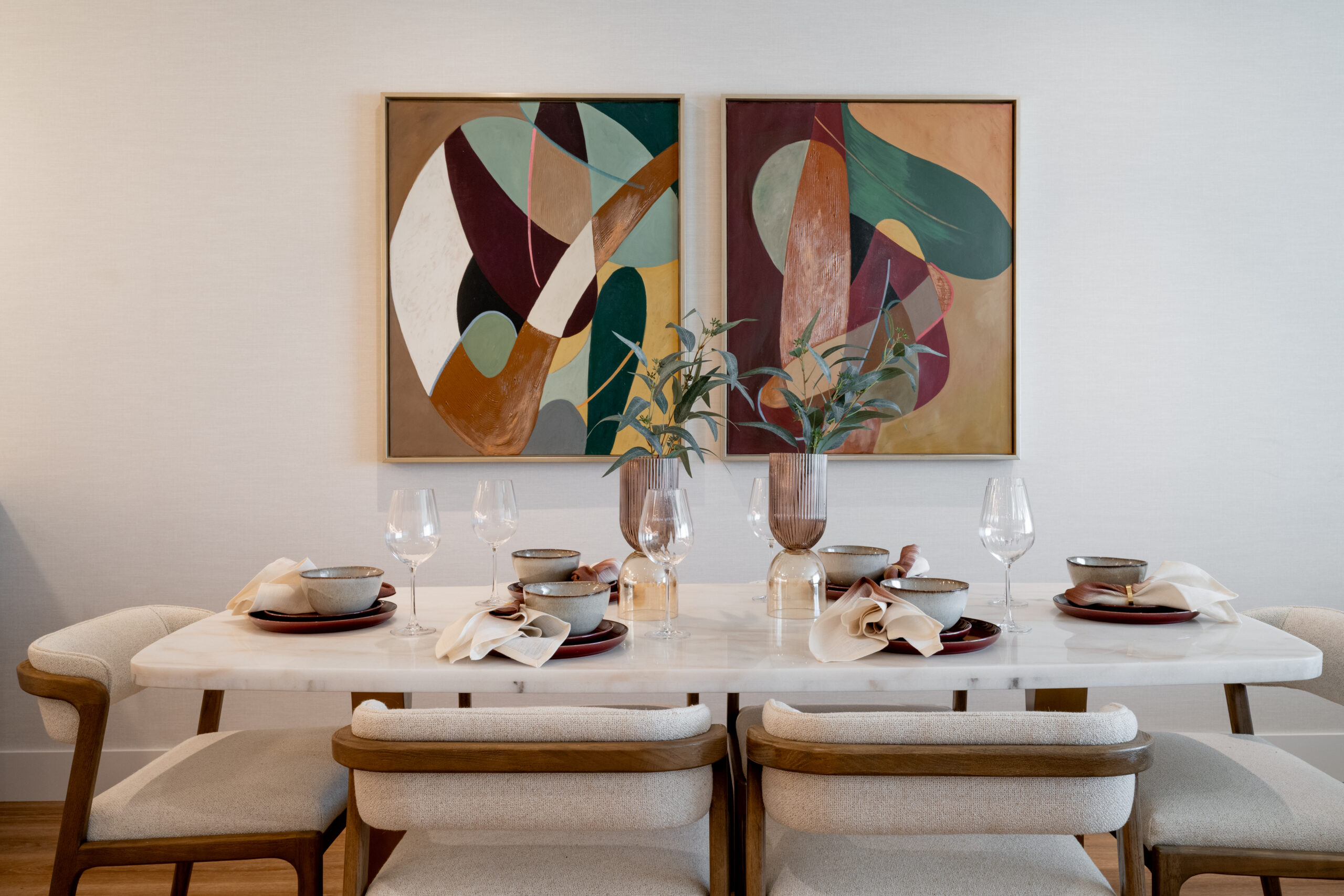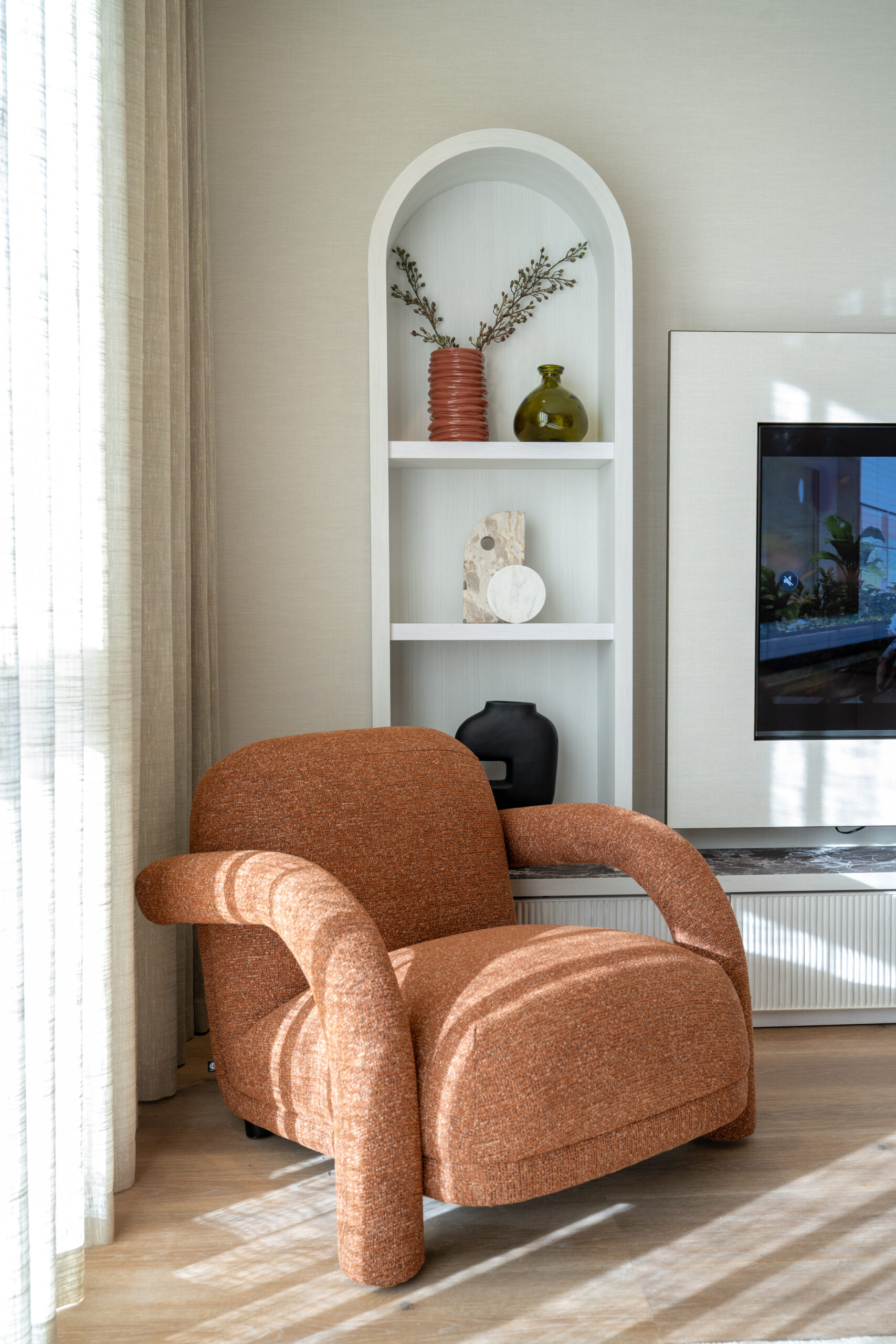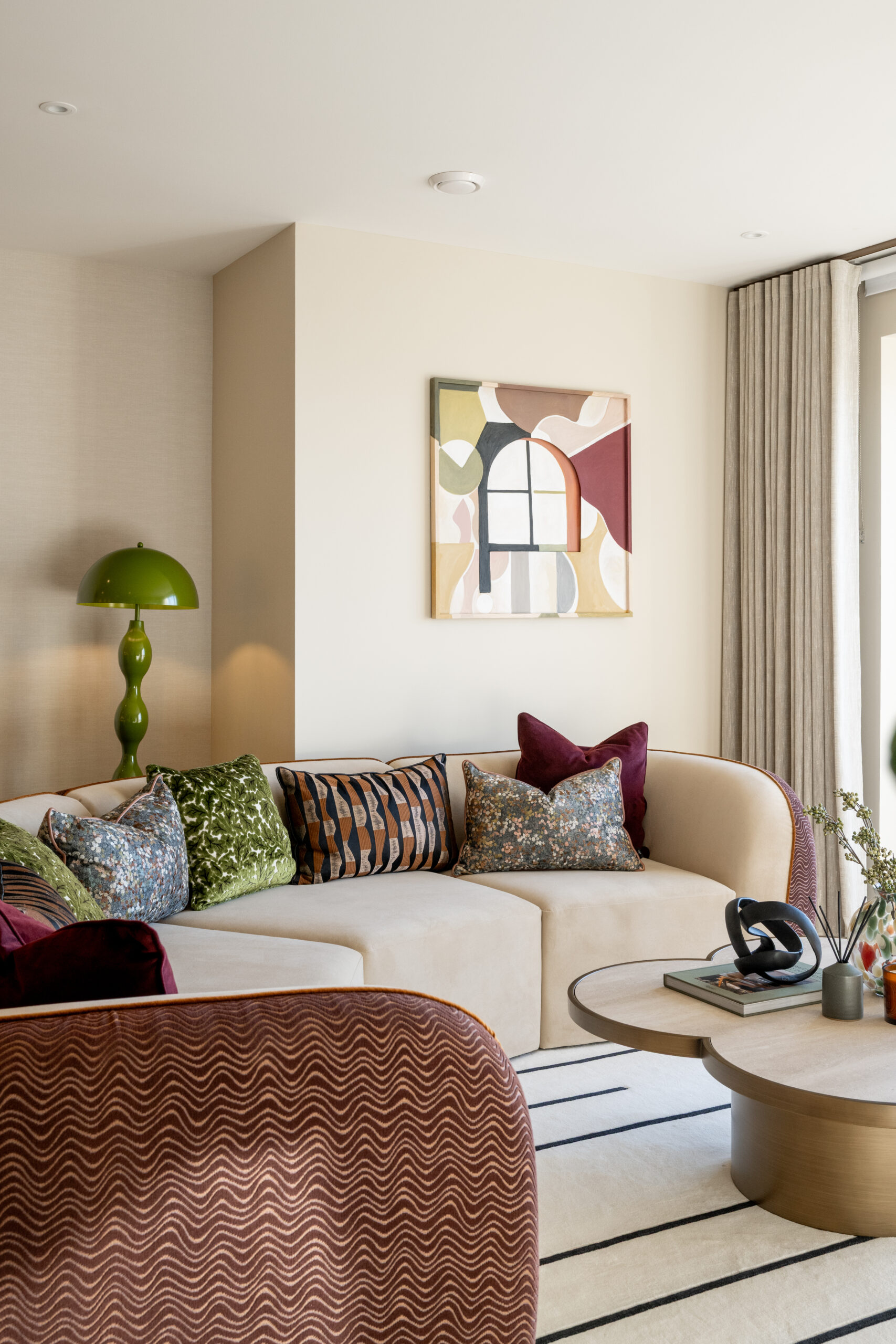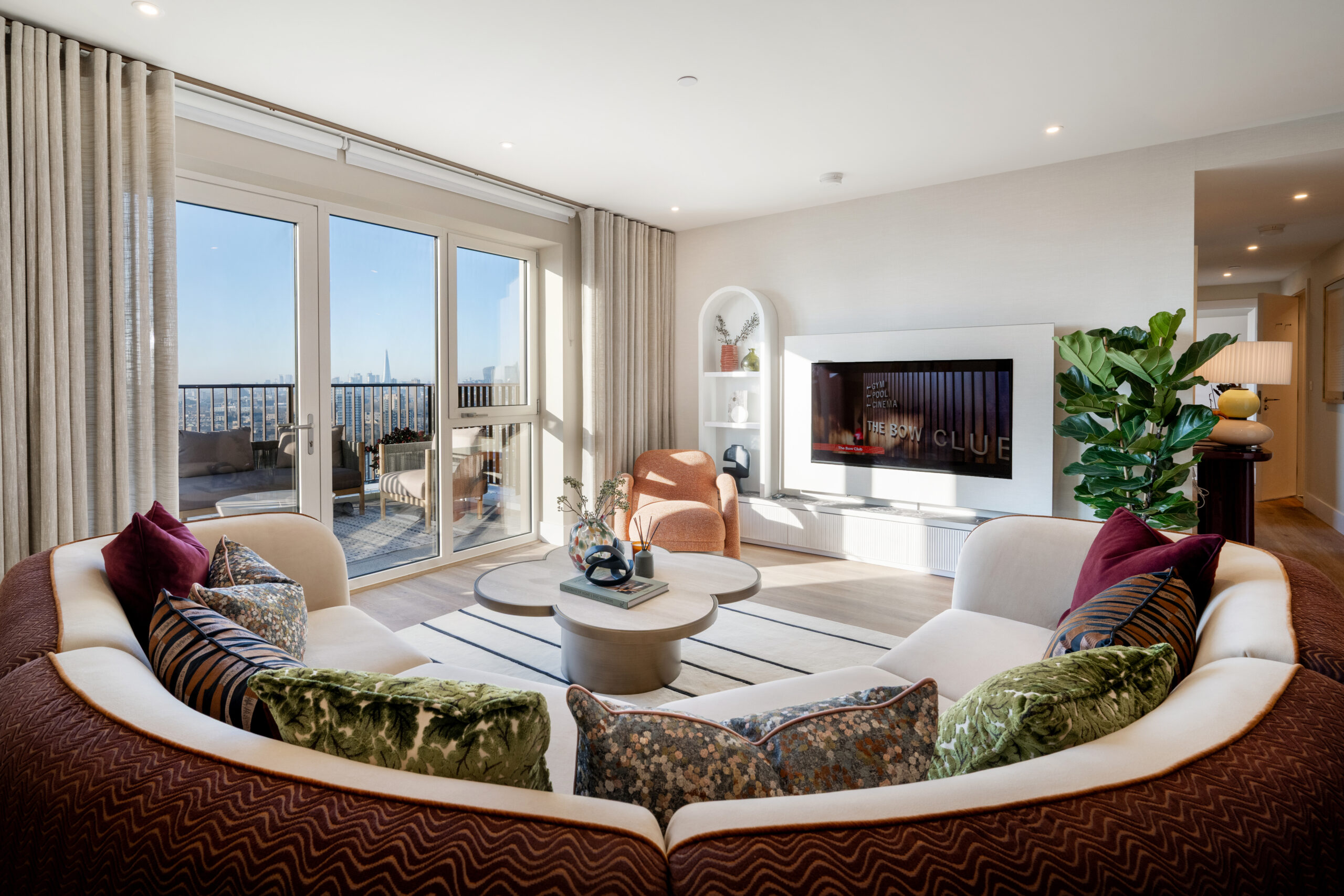 A penthouse apartment designed to blend the city and nature together. Featuring organic forms, a contrasting palette and bespoke crafted furniture to maximise the space and capture the bustle of the surrounding area.